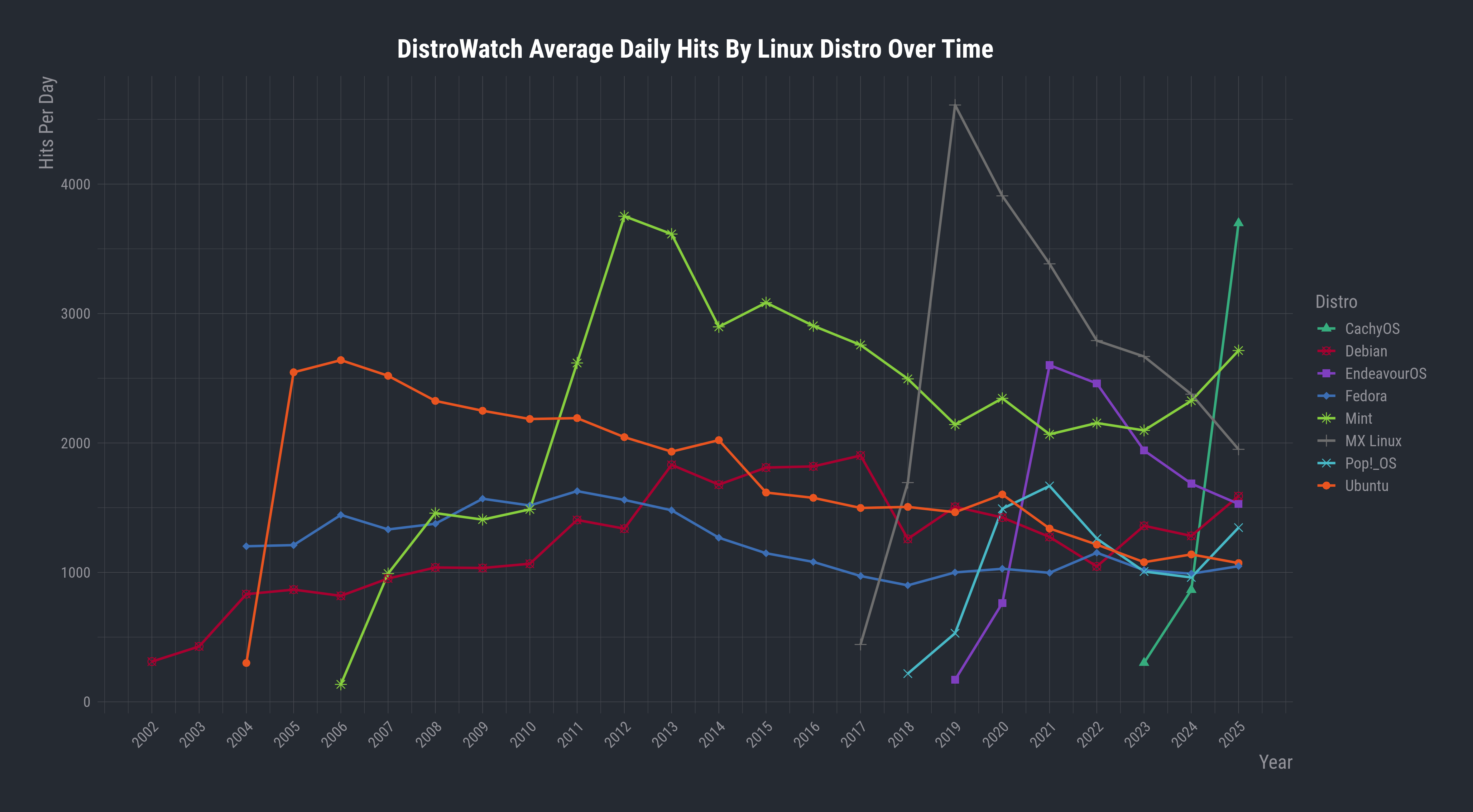 We should note that these ranks are useful but can mask or magnify patterns: they are susceptible to switches even on minor changes. For example, in 2025, Ubuntu (#8) and Fedora (#9) were separated by the tiny margin of just 24, whereas the gap between CachyOS (#1) and Mint (#2) was far larger (approximately 1,000).